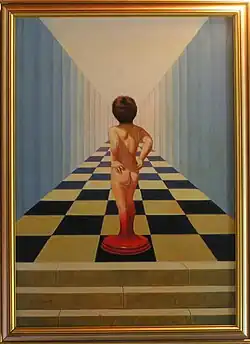 A few reviews underline both the effective elaboration of the teachings of André Breton[12] and the reference to René Magritte, with whom in particular he shared «a singularity of images» and «visual tricks» also achieved through the use of trompe-l'oeil.[13]