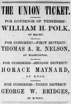 During the campaign, Polk announced he was in favor of Tennessee joining the Confederacy.[26][29] He was criticized by secessionists, nevertheless, for not speaking up in favor of separation sooner, and for earlier attacks on Confederate president Jefferson Davis.[30] By the time the campaign had gotten underway, East Tennessee was threatening to withdraw from the state and join the Union, and Polk campaigned as the candidate best suited to reconcile East Tennessee with the rest of the state.[31] He attacked Harris for ordering troops into East Tennessee, arguing the move only served to inflame already-heightened tensions in the region.[32] William G. Brownlow, a leader of the state's Unionists, reluctantly endorsed Polk as a lesser of two evils.[26] On election day, Harris won in a landslide, 74,973 votes to 43,342.[33]