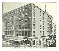 William Henry Schieffelin joined the Schieffelin company in 1860 at the age of 24. He was the 4th generation in a direct line of succession to Jacob Schieffelin. The company address at that time was 170 to 172 William Street, on the corner of Beekman Street in Manhattan.[1]