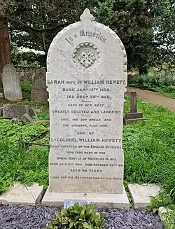 In his later life, Hewett lived at East Park Terrace in Southampton and was cared for by his daughter.[2][1] Hewett was a notable veteran of Waterloo and the Rifle Brigade wrote to him on the battle's anniversary each year to congratulate him.[5] With Albemarle (b. 1799) and General George Whichcote (b. 1794), he was one of the last three surviving British officers who served in the battle.[4] With Albemarle's February 1891 death and Whichcote's in August, Hewett became the last surviving officer.[16][17][1] He died in Southampton on 26 October 1891 and his funeral was attended by a detachment from the Rifle Brigade.[1][5] Hewett was buried at Southampton Old Cemetery, which also held the grave of fellow Waterloo veteran, Private John Russell, of the 3rd Regiment of Foot (d. 1864). Hewett's gravestone notes a wife, Sarah (1806-1883).[2]