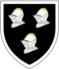 Shortly before his death in 1624, William obtained a grant of arms from the College of Arms. The arms were: Sable, three helmets argent a bordure of the last, i.e. a black shield displaying three silver helmets all within a silver border. The crest was a demi-lion guardant holding an anchor. This crest serves as the footrest of the effigy of Margaret Hungerford at Farleigh Castle. These arms bear close resemblance to those granted in 1605 to his cousin Sir Leonard Holliday, Lord Mayor of London in 1605:[8] Sable, three close helmets argent garnished or within a bordure engrailed of the second (Guillim, Display of Heraldry[9]), the differences being in the garnishing of the helmets, the form and tincture of the bordure and (for the crest) the direction in which the lion faces.[10] The pedigree in the 1663 Heraldic Visitation of Middlesex, of "Holliday of Bromley", starting with Sir Leonard Holliday, makes no mention of William Holliday.
