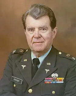 In 1979, he was recalled to active duty by the Secretary of the Army. He served another four years at Walter Reed and retired again into private practice in Joplin, Missouri where he spent the rest of his life, continuing to write papers on a variety of subjects. In 1983, Crosby was invited by the Veterans Administration to become one of 11 professors in its nationwide Distinguished Physicians Program stationed in V.A. Medical Centers throughout the country. He resigned from that post two years later to take up private practice in Joplin, where he would spend his remaining years.