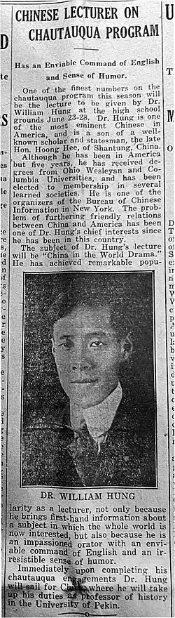 From 1921 to 1922, Hung served as Chinese Secretary for the Board of Foreign Missions of Methodist Episcopal Church giving more than one hundred lectures throughout the United States. Once, when he had finished his talk, a member of the audience told him that his speech was so exciting that should take this as a career. Hung was personable, funny and succinct and soon became a popular figure on the lecture circuit. In 1922, Hung taught at DePauw University in Indiana as Horizon Lecturer. In 1923 he became the Acting Head of the History Department of Yenching University.[9]
