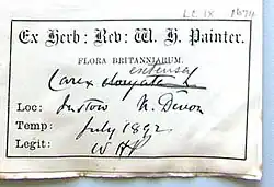 William Hunt Painter donated his herbarium to the University College, Aberystwyth, but there are also significant specimen plants at Kew and Oxford, in the Department of Botany at Aberdeen, the Natural History Museum in London, the University of Birmingham, the National Botanic Garden at Dublin, the Derby Museum and Art Gallery, the University of Glasgow, the Hancock Museum at Newcastle upon Tyne, Kew, Manchester Museum, Cardiff and Oxford.[11]