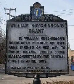 In 1634, William Hutchinson, his wife Anne, and his other ten children sailed from England to New England on the Griffin, the same ship that had taken Cotton and their oldest son a year earlier. The family first resided at Boston where Hutchinson was admitted to the Boston Church on October 26, 1634, and his wife was admitted seven days later.[5] He became a merchant in Boston and took the freeman's oath there in 1635.[6] He was one of the town's Deputies to the Massachusetts Bay General Court from 1635 to 1636, and was also a selectman from 1635 to 1637, attending a selectmen's meeting for the last time in January 1638 as his tenure in Boston was coming to an end.[7]