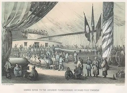 The Japanese reached Aspinwall and boarded the Roanoke 25 April 1860. Commodore McCluney greeted the delegation with full honors and entertained the principal ambassadors, Shinmi Masaoki (新見正興), Muragaki Norimasa (村垣範正), and Oguri Tadamasa (小栗忠順) as Perry had in 1854 when McCluney commanded the Powhatan.[53] Ambassadors, embassy staff, and servants numbered more than seventy and were accommodated in special quarters McCluney had erected on deck.[54] The Roanoke departed 26 April and arrived in 13-days off Sandy Hook for New York.