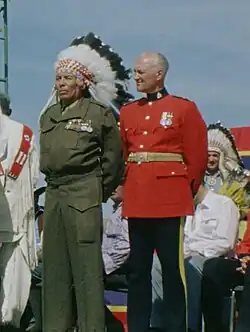 Higgitt was given the Blackfoot name "Great Chief" and was presented with a head-dress and peace pipe by Joe Chief Body, Bob Black Plume, and Blood Reserve war veteran Pat Eaglechild.[90] In turn, Higgitt and Sgt. B. Thorstad, NCO in charge of the RCMP's Cardston Detachment, presented Chief Jim Shot Both Sides with an honorary RCMP Centenary Winchester Rifle in appreciation of the one hundred years of peaceful association between the Blood Tribe and the RCMP; pledging that the RCMP would continue to work in the service of the Kainai and the Blackfoot Confederacy. Centennial neck medallions were also given to other present-day Chiefs of the tribes involved in the signing of Treaty 7: Chief Leo Pretty Young Man of the Blackfoot Band, Chief Gordon Crowchild of the Sarcee Band, Chief John Snow of the Wesley Band, and Chief Frank Kaquitts of the Chiniquay Band.[91] In her address to Higgitt and the assembled Chiefs, Alberta Indian Princess Jenny Fox said: "I'm very happy to see so many people down here to honor the RCMP and new members of the Kainai Chieftainship. In spite of all the criticism and unfairness that some people give to the RCMP, we have to admit one thing, and that is that they have given us one of the most important things in our society today, that which is law and order".[92]