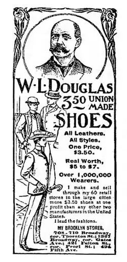 Douglas' workers were members of the Boot and Shoe Workers' Union, which in 1899 sharply raised its dues in order to finance improved benefits and welfare funds.[8] The rank and file were unhappy with this increase, and the dispute threatened the company's ability to label its products with the union stamp. Douglas, who had a reputation as a fair employer, worked with the union to ensure his employees paid the higher dues.[9]