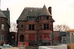 In 1987, the Red Cross intended to demolish the mansion, originally located west of John R. Street, to make way for their new building.[7] Preservationists succeeded in moving the Livingstone House about one block to the east to 284 Eliot Street,[8] but the building languished for many years. The William Livingstone House's subsequent blight and slumping circular tower earned it the nickname Slumpy among the ruins photography community.[2] The building continued to decay to the point of collapse[9] and was completely demolished on September 15, 2007. The William Livingstone House was commemorated in a painting by Lowell Boileau entitled Open House, which was unveiled the day of its demolition.[10]