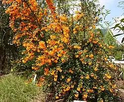 From the Valdivian temperate rain forests of Chile, Lobb brought back the Chilean firebush (Embothrium coccineum), the Chilean bellflower (Lapageria rosea) (the national flower of Chile), the flame nasturtium (Tropaeolum speciosum) and the Chilean lantern tree (Crinodendron hookerianum).[30] He also collected seeds of three species of myrtle tree, Luma apiculata, Ugni molinae and Luma chequen as well as "four most interesting Conifers for this country ... that South America produces"[31] – the Guaitecas cypress (Pilgerodendron uviferum), the Patagonian cypress (Fitzroya cupressoides), Prince Albert's yew (Saxegothaea conspicua) and Podocarpus nubigenus as well as seeds of the hardy Antarctic beech (Nothofagus antarctica) and several other shrubs including Escallonia macrantha.[30]