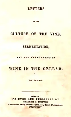 In 1844, William Macarthur, regarded at the time as a leading Australian viticulturist, published a small volume, Letters on the Culture of the Vine, Fermentation, and the Management of the Cellar, which was widely read.[5] He was President of New South Wales Vineyard Association and had a vineyard and extensive cellars at the family estate at Camden Park.[6]