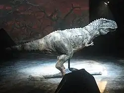 He chose Sonny Tilders, one of the film and television industries' leading professionals in the field of animatronic puppetry, to head the development of the dinosaurs.[4] May designed the fifteen life-size dinosaurs used in the production.[3] Ten species of dinosaurs are included in the show,[4] including the Liliensternus, Plateosaurus, Allosaurus, Stegosaurus, Utahraptor and Torosaurus.[4] The largest dinosaur in the production, the Brachiosaurus, which most resembles the cranes which inspired the show, measures 56 feet long and 36 feet tall.[4]