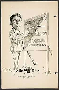 William May Garland was born in Westport, Maine on March 31, 1866.[3] In 1882 at age 16, he went to Boston, and by 1884 he was in Chicago. In 1890, he moved to Los Angeles working as auditor of the Pacific Cable Railway Company until 1894, when he formed his real estate business, the W. M. Garland Company, headquartered in Henry Huntington's Pacific Electric Building, which became the site of the Jonathan Club. He was Huntington's principal sales agent.[4] In September 1895, Garland and Huntington were among the founding members of the Jonathan Club. William May Garland's granddaughter was told that when deciding the name of the club, he said "let's call it the Jonathan Club after my father" (Jonathan Garland). There are other theories on the naming of the club, but this is what William, as one of the founders, told his family.