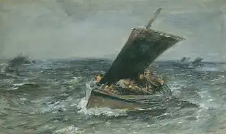 In April 1914 Reid offered Blyth "The Emigrants" in part exchange for Eugène Boudin's "Les Fourges" plus £150 in cash. This deal fell through and ultimately Blyth paid £750 in several instalments. Blyth abandoned his purchase of McTaggart in 1925 and switched to Samuel Peploe.[2]