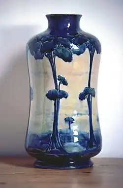 He then developed his famous Florian Ware, with heavy slip and a translucent glaze which produces brilliance of colour.[4] Florian Ware was influenced by Art Nouveau. It was decorated entirely by hand, with the design outlined in trailed slip using a technique known as tubelining. Florian Ware was a great success and won him a gold medal at the World's fair, the St. Louis International Exhibition in 1904. Unusually at that time, he adopted the practice of signing his name, or his initials, on nearly all the pottery he designed, the production of which he personally oversaw. In due course the extent to which his success had overshadowed Macintyre's other manufacturing activities resulted in resentment on the part of his employers, culminating in their decision in 1912 to close down his studio.