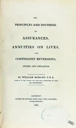 He was born in Bridgend, Glamorgan, Wales, son to physician William Morgan and Sarah (sister of Richard Price). William's brother was George Cadogan Morgan. At eighteen he received medical training at Guy's Hospital, London, working also as an apothecary to pay his way. He did not complete his training, but after one year returned to Bridgend to join his father's practice. He was not popular with his father's patients: they thought him inexperienced and they resented receiving treatment from someone with a deformity—Morgan suffered from a club foot. After his father's death he left medicine and in 1774, on the recommendation of his mother's brother, the renowned Richard Price, he was appointed Assistant Actuary of the Equitable Life Assurance Society.[2] In February 1775, after the death of John Pocock, he was elected Actuary. By the time he retired on 2 December 1830, 56 years later at the age of 80, he had laid the foundations of the actuarial profession —in fact the term "actuarial" became attached to the profession because of his title.