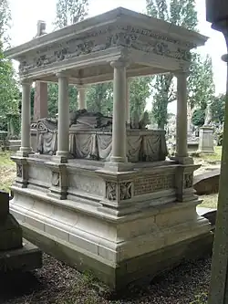 He died at the age of 77 in Bayswater, London and is buried[14] in the nearby Kensal Green Cemetery where a monument to his memory was erected. The monument lies on the north side of the main path, midway between the entrance and the main chapel, and although not in the front line of graves it is easily spotted due to its unique form. The tomb was designed by Godfrey Sykes.[15]