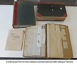 These are not personal papers but maps, pamphlets, and scrapbooks of newspaper clippings and other items of historical interest about life and government at that time. They are collectively known as The Hurst Papers, and are available in the Morris Miller Library of the University of Tasmania.[48]