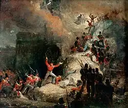 On 13 February 1812, Nicholas left Cadiz for Elvas, and took part in the third and last Siege of Badajoz. On the night before the siege of 6 April 1812, having volunteered to reconnoitre, he stripped, and crossed the artificial lake to the east of Badajoz, known as the inundation,[23] and ascertained the safest passage for the column. To him was confided the task of leading the troops of the advance to the great breach.[24] Nicholas and Lieutenant Emmett worked to lead men of the 4th Division into the Santa Maria breach amid the chaos and confusion,[24] and Nicholas was observed by Lieutenant Shaw, of the 43rd, making incredible efforts to force his way with few men into the Santa Maria bastion.[25] He led at least two rushes with small numbers of men, trying to reach the top, but was each time repulsed.[24] He was wounded at least four times: by a musket-ball in his knee-pan, and by a bayonet thrust in the great muscle of his right leg; his left arm was broken and his wrist wounded by a musket-shot.[26] Then, on seeing Lieutenant-colonel Macleod and Captain James fall,[27] and hearing the soldiers ask who was to lead them,[7] he led a third onset with some seventy men,[24] ordering two of them to carry him up the breach. One of his supporters was killed at the top, and Nicholas was shot through the chest, the musket-ball breaking two ribs. This shock propelled him from the top to the bottom of the breach.[7]