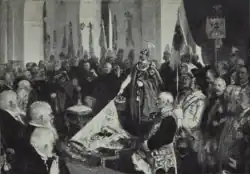 Pape painted highly detailed large-scale paintings, known as vedutas, in Berlin, but specialized primarily in history painting. His painting, One Empire, One People, One God (German: Ein Reich, Ein Volk, Ein Gott), which depicted the 18 January 1896 celebration marking the 25th anniversary of the founding of the German Empire, attracted the attention of the German court, who purchased the painting, which was owned personally by Kaiser Wilhelm II. The Kaiser also personally owned Paper's 1898 painting, Confirmation of the Crown Prince and Prince Eitel Friedrich (German: Die Konfirmation des Kronprinzen und des Prinzen Eitel Friedrich).[1]