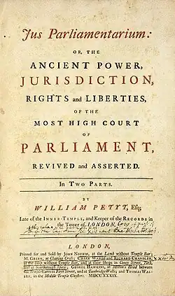 - ^ a b William Petyt (1739), Jus parliamentarium: or, the ancient power, jurisdiction, rights and liberties, of the most high court of Parliament, revived and asserted. In two parts. By William Petyt, Esq; Late of the Inner-Temple, and Keeper of the Records in the Tower of London (1st ed.), London: Printed for and sold by John Nourse, at the Lamb without Temple Bar; M. Green, at Charing Cross; Cæsar Ward, and Richard Chandler, at the Ship without Temple Bar, and at their shops in Coney Street, York, and at Scarborough Spaw; George Hawkins, at Milton’s Head between the Temple Gates in Fleet Street, and at Tunbridge Wells; and Thomas Waller, in the Middle Temple Cloysters [London], OCLC 613603611.