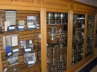 The WPDU has participated in, and traveled extensively to intercollegiate debate competitions since its early history.[9] A regular participant regional and national competitions, the WPDU has previously won the Pennsylvania State Debating Championship,[10] qualified for the National Debate Tournament forty-five times,[3][4] and captured the 1981 National Debate Tournament national championship.[6] In addition, at the 1947 Grand National Forensic Tournament,[11] a two-man affirmative debate team won the national championship competing against 89 other teams, while Pitt's negative team finished as runners-up.[2] The WPDU has also finished first in the American Debate Association’s varsity rankings and its debaters have won hundreds of individual speaking awards.[12] In the past the WPDU hosted major intercollegiate debating competitions,[13][14] and through the years, the team has appeared on television,[15] including once hosting its own weekly television show in the 1950s,[16] and its success has enjoyed coverage in local and regional media.[17][18][19]