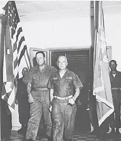 His units subsequently took part in the first skirmishes with Vietcong in Le My village in Quảng Nam Province. However Collins and his 13-month overseas tour was near to its end and the commandant, General Wallace M. Greene, selected recently promoted Major General Lewis W. Walt as his substitute within III Marine Expeditionary Force. Collins relinquished command to Walt on June 5, 1965, and returned to the United States. For his service in early phase of Vietnam War, Collins received the Legion of Merit with Combat "V".[10][2]
