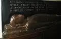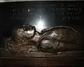 The W. T. Wyllie memorial in Portsmouth Cathedral is positioned on the East wall of the Quire and east of the Corporation Pew and remembers the second son of William Lionel and Marion Amy Wyllie. William Thomas Wyllie served with the 2nd Durham Light Infantry and was killed in action at Montauban on the Somme on 19 July 1916. He was acting as a Brigade Major at the time and is buried in Mametz Cemetery. He left a widow and three children. The memorial features a sculptured figure in silhouette/high relief which lies along the bottom half. This figure is the dead body of an officer lying on his back, arms by his side. His shirt sleeves are rolled up and he wears braces, trousers and boots. His head rests on a cushion surrounded by a laurel wreath. The inscription is incised in white lettering along the top half of the memorial. The bronze founders were Messrs A. B. Burton.[26][27]