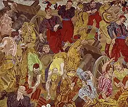 In 1916 Roberts enlisted in the Royal Regiment of Artillery as a gunner, serving on the Western Front in the Ypres sector, north of the Menin Road and at Arras. Having been on active service for the best part of two years, he successfully applied to the Canadian War Records Office for a commission to paint a large-scale war subject. In April 1918 he returned to London as an official war artist, with the proviso that the work should not be in the Cubist style.[12] The outcome of the commission was The First German Gas Attack at Ypres, a powerful expressionist work that is on permanent display in the Canadian War Museum in Ottawa. Roberts was subsequently commissioned by the British Ministry of Information, for whom he painted A Shell Dump, France (1918–19), now in the Imperial War Museum collection along with twelve watercolour drawings of his experiences at the front They rival the bitterness and social realism of the German artists Otto Dix and George Grosz.[13] In 1978 Roberts published a memoir of his experiences at the front – 4.5 Howitzer Gunner RFA: Memories of the War to End War 1914–1918.[14]