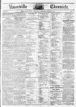 In 1869, the Whig, which was the only pro-Republican newspaper in the post-bellum South, was sold to Knoxville businessman Joseph Mabry, who attempted to rebrand it as a Democratic Party newspaper. To ensure the survival of Knoxville's pro-Republican newspaper tradition, Rule left the Whig in 1870 and formed the Knoxville Chronicle, which he considered the true successor to Brownlow's paper. When Brownlow returned to Knoxville after his Senate term had ended in 1875, he purchased a half stake in the Chronicle. The paper was published as the Whig and Chronicle until Brownlow's death in 1877.[4]