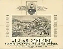 Around the time he purchased the Eskbank works, Sandford became a vigorous protectionist, leading the Lithgow National Protection Association.[9] The issue of protection against imports was the principal political division of late 19th-century Australia. In New South Wales, almost alone of the Australian colonies, there was widespread support for free trade. A growing force was the Labor Party; it somewhat favoured protection, as a means to maintain relatively high wages, but also advocated nationalisation of major industries, complicating its policy toward enterprises like Sandford's. However, at the 1891 election, it was the protectionists who won office in New South Wales.