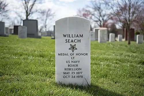 Lieutenant Seach died October 24, 1978, at the age of 101, and is buried at Arlington National Cemetery, in Arlington, Virginia.[4] When he died he was the oldest and longest-living recipient of the Medal of Honor, and the last surviving US veteran of the Boxer Rebellion to receive the medal.[5]