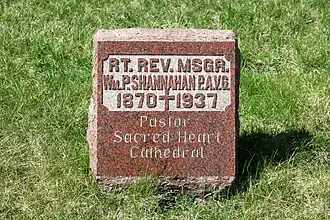 Bishop Henry Rohlman nominated Shannahan twice for Papal honors; the first time as a Domestic Prelate and the second time as a Protonotary Apostolic. Both honors were bestowed by Pope Pius XI.[3] In the 1930s he worked with Msgrs. Martin Cone and George Giglinger to develop a local radio program on WOC that featured Catholic topics.[4] Msgr. Shannahan died on October 22, 1937, at the age of 67.