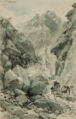 In 1868, Simpson travelled to Abyssinia covering the British expedition to Abyssinia.[5][6] Initially, his employer, The Illustrated London News used sketches supplied by one of the soldiers on campaign, Colonel Baigrie, but as his pictures were mostly landscapes, the paper felt that Simpson could add more life to the accounts of the war. The artist arrived at Suez on 18 June 1868, but by the time he neared the front, news came that Magdala had fallen to the Anglo-Indian force. Nonetheless, he was able to observe the retreat of the Abyssinian army, and the remains of the royal quarters of Emperor Tewodros II at Magdala, which had been looted by the British Army.[7] He arrived back at Dover on 2 July 1868 and the Illustrated London News published a special folio volume on the British expedition to Abyssinia containing many of Simpson's and Baigrie's drawings.[3]