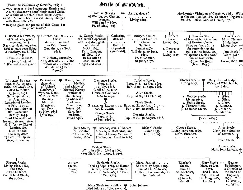He married firstly in 1638 Elizabeth Godfrey of Kent, daughter of Richard Godfrey, MP for New Romney and Mary Moyle. He married secondly in 1662 Mary Mellish, widow of Michael Harvey (a brother of the noted scientist William Harvey). He had issue by both marriages. His daughter, Mary Steele (died 1673), married George Boddington (1646–1719), a director of the Bank of England.[6] His grandson was the writer Richard Steele (1672–1729), the son of the elder Richard Steele, William's only son from his first marriage, and his wife Elinor Symes (née Sheyls). The elder Richard was an attorney who spent much of his life in Ireland: he died in 1676.[7]