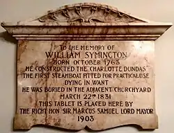 William Symington (1764–1831) was a Scottish engineer and inventor during the Georgian era.[1] He is most well known as the builder of the first practical steamboat, the Charlotte Dundas.[2][3] The engine has been described as "without doubt the most compact and efficient marine steam engine up to that time" and its design would influence later steamboat and steamship engine designs.[1] While Symington died in poverty after failing to commercialise his steam engine designs, he is still credited as one of the great inventors of the early Industrial Revolution.[4]