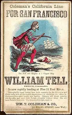 William Tell Coleman (1824–1893) was an American pioneer and politician who served as the Chairman of the San Francisco Committee of Vigilance.[1] He later served two separate terms in the California State Assembly in 1859 and 1861.[2] He was the Democratic candidate for U.S. Senate in 1865, but lost to Republican Cornelius Cole.