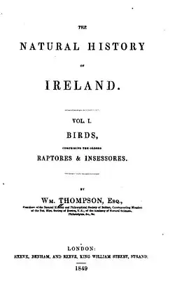 William Thompson (2 December 1805 – 17 February 1852) was an Irish naturalist celebrated for his founding studies of the natural history of Ireland, especially in ornithology and marine biology. Thompson published numerous notes on the distribution, breeding, eggs, habitat, song, plumage, behaviour, nesting and food of birds. These formed the basis of his four-volume The Natural History of Ireland, and were much used by contemporary and later authors such as Francis Orpen Morris.[1]