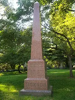 Ticknor was more concerned about Hawthorne, writing to Sophia, "You will be glad to hear that your patient continues to improve."[4] In Philadelphia, the duo visited Fairmount Park and Ticknor offered Hawthorne his jacket for warmth before they returned to the Continental Hotel.[3] Hawthorne wrote to Fields that "our friend Ticknor is suffering under a billious attack... He had previously seemed uncomfortable, but not to an alarming degree."[5] A physician offered various medicines, but Ticknor died on the morning of April 10, 1864. George William Childs arrived shortly after and accompanied the distraught and grieving Hawthorne back to Boston.[6] The sudden loss of Ticknor was devastating to the already failing health of Hawthorne, who died about a month later on May 19. Ticknor was buried at Mount Auburn Cemetery; the distinguished of both literary and business circles came to pay their final tribute.
