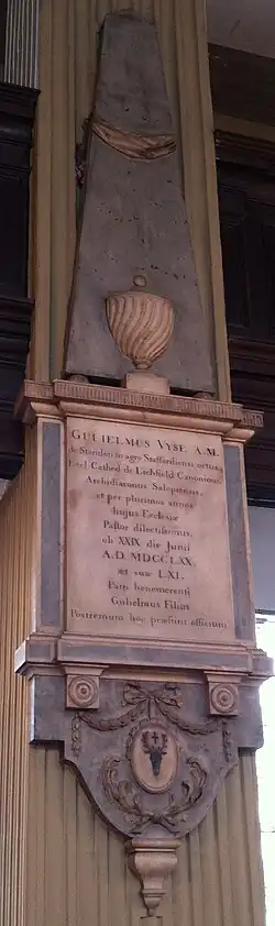 One of his sons, Richard, became a General.[7][8] Another, William, was Archdeacon of Coventry,[9] and it was he (according to the inscription) who had the monument to his father set up in Birmingham Cathedral. William had also daughters, one of whom, Mary (born 1745), married the Right Revd. Spencer Madan, Lord Bishop of Peterborough; and, dying in 1827, she was buried at Lichfield in the same vault as her brother General George Vyse.[10] Their sister Catherine in 1768 became the second wife of Sir George Smith, 1st Bart., was widowed in the following year, and died in 1786.[11]