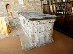- North side: ... simul cum Willm'o Wadh'm filio eor'dem (cordem?)... que obiit ... die mensis ... East side: Anno D'ni mill'mo CCCC ... et qui quidem Will'mus ...