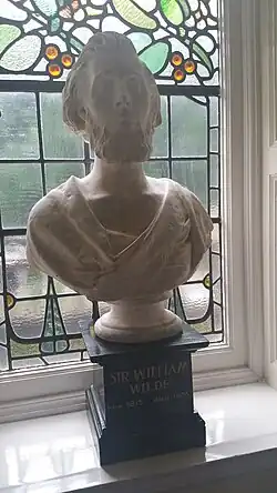William Wilde was born at Kilkeevin, near Castlerea, in County Roscommon, the youngest of the three sons and two daughters of a prominent local medical practitioner, Thomas Wills Wilde, and his wife, Amelia Flynne (d. c.1844).[2] His family were members of the Church of Ireland. He was descended from a Dutchman, Colonel de Wilde, who went to Ireland with King William of Orange's invasion army in 1690, and numerous Anglo-Irish ancestors. He received his initial education at the Elphin Diocesan School in Elphin, County Roscommon. In 1832, Wilde was bound as an apprentice to Abraham Colles, the pre-eminent Irish surgeon of the day, at Dr Steevens' Hospital in Dublin. He was also taught by the surgeons James Cusack and Sir Philip Crampton and the physician Sir Henry Marsh. Wilde also studied at the private and highly respected school of anatomy, medicine, and surgery in Park Street (later Lincoln Place), Dublin.[2] In 1837, he earned his medical degree from the Royal College of Surgeons in Ireland. In the same year, Wilde embarked on an eight-month cruise to the Holy Land with a recovering patient, visiting various cities and islands throughout the Mediterranean. Porpoises were flung on board the ship, Crusader, and Wilde dissected them. Taking notes, he eventually composed a two-volume book on the nursing habits of the creatures.[3] Among the places he visited on this tour was Egypt. In a tomb, he found the mummified remains of a dwarf and salvaged the torso to bring back to Ireland. He also collected embalmed ibises.