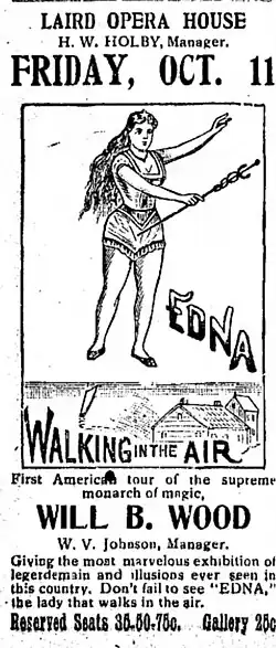 Wood was awarded patents, dated November 12, 1889,[8][9] for the equipment of a levitation illusion he called "Edna" in which a lady would be lifted up in mid-air and stay there, during which she walked, turned around, and turned over, all while in the air. Wood won a $3,200 verdict in December 1890 against another performer for infringing his patents.[10] After Wood's death, the magician Adelaide Herrmann used this illusion under the name of "The Maid of the Moon".[11]