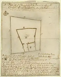 The Norfolk antiquary John Kirkpatrick produced a plan of the site in about 1720. It shows that at this time, few remains of the chapel existed.[23] The earthworks now consist of two concentric enclosures containing mounds of flint rubble which are likely to be the remains of buildings—probably the chapel and associated monks’ quarters. The outer enclosure is likely to have enclosed the former churchyard.[24]