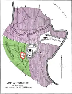 A boost to the shrine's popularity occurred after 1376, when William was adopted by the Norwich Peltier's Guild, whose annual service at Norwich Cathedral included a child playing the part of William.[22] There was a scholars' guild dedicated to St William in Bishop's Lynn (now King's Lynn).