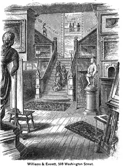 The gallery was located at the corner of Bedford and Washington Street until 1885.[9][10] The gallery moved in 1885 from downtown to Back Bay, where it remained until the business closed around 1907.[11][12][13] "Williams & Everett's Galleries, at No. 79 Boylston Street, were ... designed and built expressly as a repository of the Fine Arts. ... The architectural adornment of the interior is of the English Renaissance, with carved wood and heavy beams in sight. On one side is a carved chimney piece, extending to the ceiling, and near this is a grand staircase leading to a series of galleries, extending from the carved wood coigne which looks down into the store, to the balcony overlooking Park Square. The wainscoting of dark wood is surmounted with pomegranate hangings, and the ceiling is effectively decorated in plain and harmonious tints. Incandescent lights placed in the ceiling in a novel and original manner, are used throughout the store and galleries."[14]