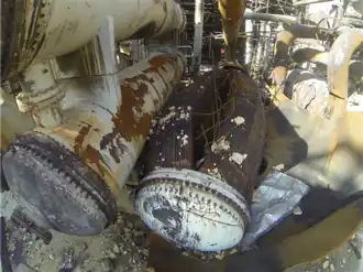 ![]() Post-blast photograph of the heat exchanger which ruptured catastrophically, causing extensive explosion and fire damage to the plant. | |