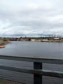 The Williamson rises from a large spring in central Klamath County, on the north side of Fuego Mountain, in the Winema National Forest, about 40 miles (64 km) northeast of Klamath Falls. A portion of the Williamson River is nicknamed Root Beer Falls "because the water is laden with nutrients carried from the Klamath Marsh a few miles upstream" and "Foam that builds up at the base of the falls gives the appearance of a root beer float".[10] ). It flows in a large arc north through the mountains, then west, then southwest through Klamath Marsh and the Klamath Marsh National Wildlife Refuge. Downstream of the refuge, the river flows roughly parallel to U.S. Route 97, receiving Spring Creek from the right at Collier Memorial State Park, about 5 miles (8.0 km) north of Chiloquin. At Chiloquin, it receives the Sprague River from the left at about river mile (RM) 11 (river kilometer (RK) 18). The Williamson enters the northern end of Upper Klamath Lake near Modoc Point, about 20 miles (32 km) northwest of Klamath Falls.[11]