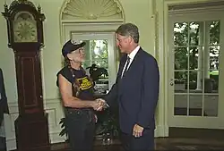 Meanwhile, two collaborations with Waylon Jennings were released: WWII in 1982,[75] and Take it to the Limit in 1983. In the mid-1980s, Nelson, Jennings, Kristofferson, and Johnny Cash formed The Highwaymen, a supergroup who achieved platinum record sales and toured the world.[76] Meanwhile, Nelson became more involved with charity work, such as singing on "We Are the World" in 1984.[77] In 1985, Nelson had another success with Half Nelson, a compilation album of duets with a range of artists such as Ray Charles and Neil Young.[78] In 1980, Nelson performed on the south lawn of the White House. The concert of September 13 featured First Lady Rosalynn Carter and Nelson in a duet of Ray Wylie Hubbard's "Up Against the Wall Redneck Mother". Nelson frequently visited the White House, where, according to the biography by Joe Nick Patoski, Willie Nelson: An Epic Life, he smoked marijuana on the White House roof.[79]