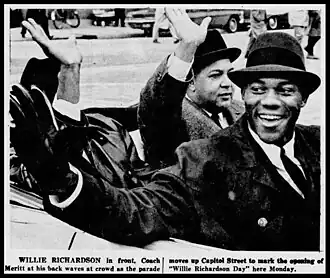 Mayor Allen C. Thompson of Jackson proclaimed January 14, 1963, to be "Willie Richardson Day" in honor of the football star's exploits.[7] Initiated with a parade and a celebratory meeting at city hall, the event was lauded in the city's black newspaper as an event when "for the first time since [Jackson's] founding some 150 years ago, by official proclamation a day was set aside, and the entire city called upon to join the observance and celebration honoring a Negro."[7]